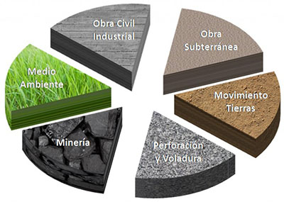 Grandes movimientos de tierras, donde se incluye perforación y voladura, estabilización de suelos, plantas de áridos y hormigones, y equipos de asfaltado.